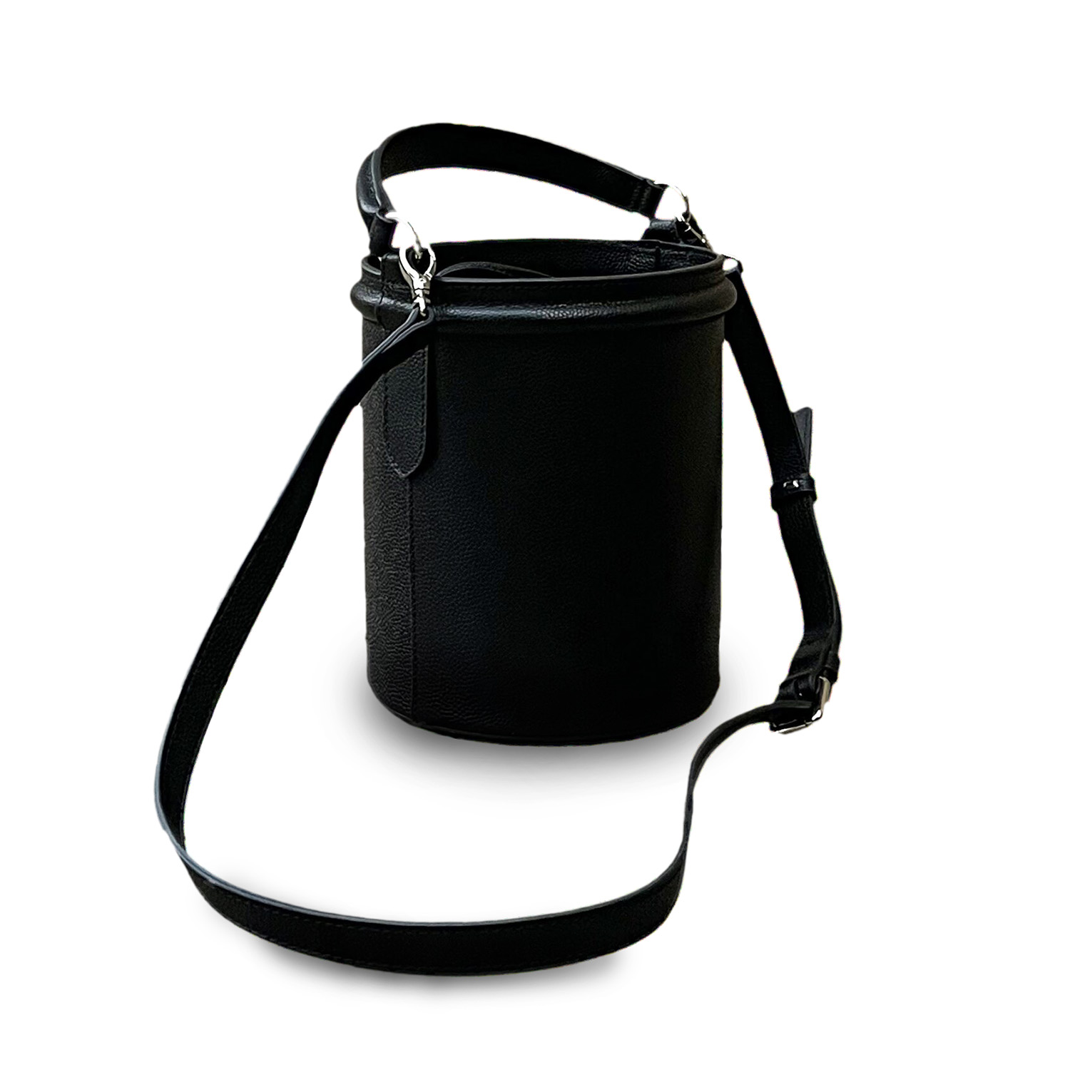 Ведро может стать оригинальным аксессуаром и самым главным акцентом в образе, если это сумка-ведро от бренда MASLOV. Она представляет собой небольшой цилиндр из черной натуральной кожи, имеет жесткое дно и стенки. У сумки есть пара коротких ручек и длинный регулируемый ремешок для ношения на плече. Благодаря карабинам его можно отстегивать.