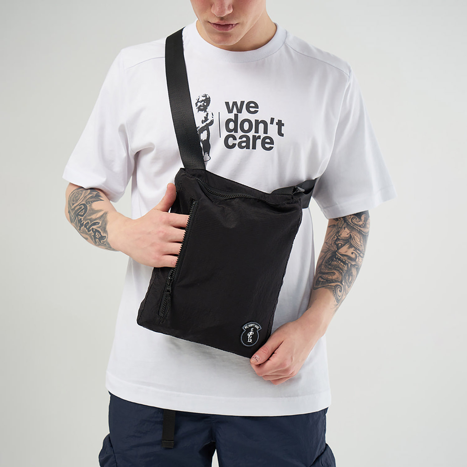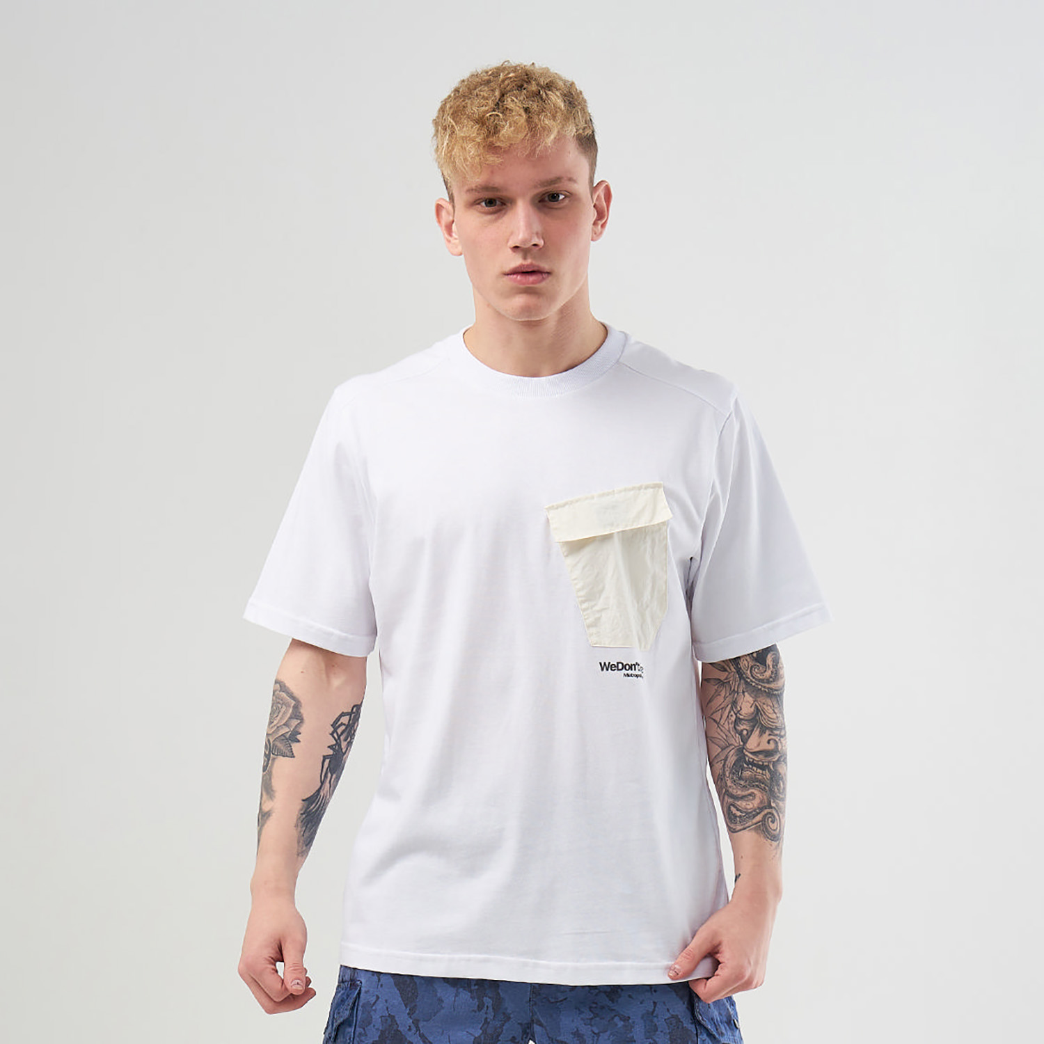 Футболка прямого кроя сшита из натурального хлопка средней плотности. Продолжая вдохновляться армейской тематикой, дизайнеры дополнили модель карманом из нейлона, который закрывается на липучку. Под ним расположен принт We Don’t Care.