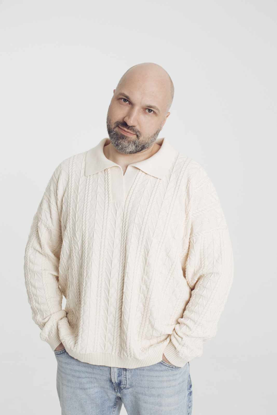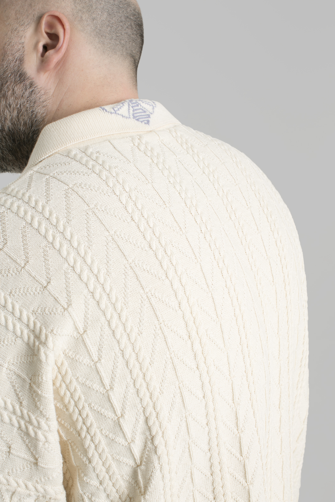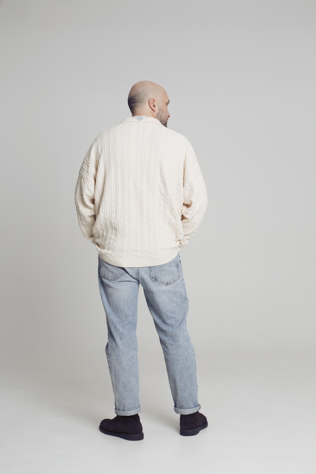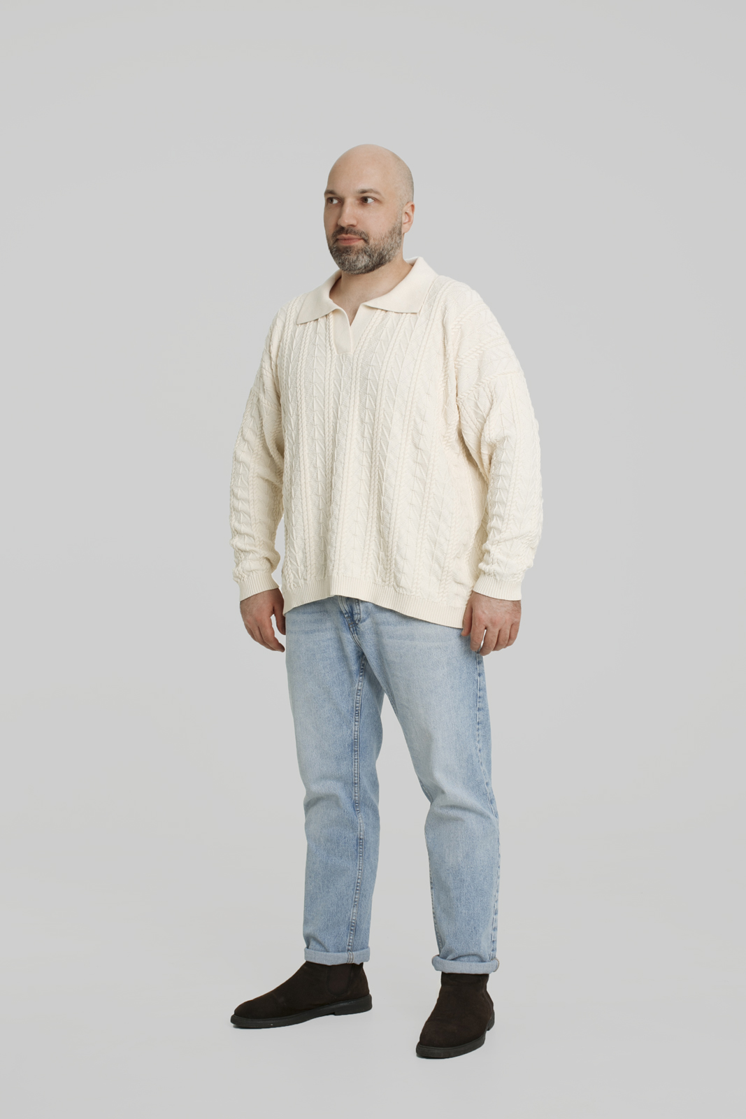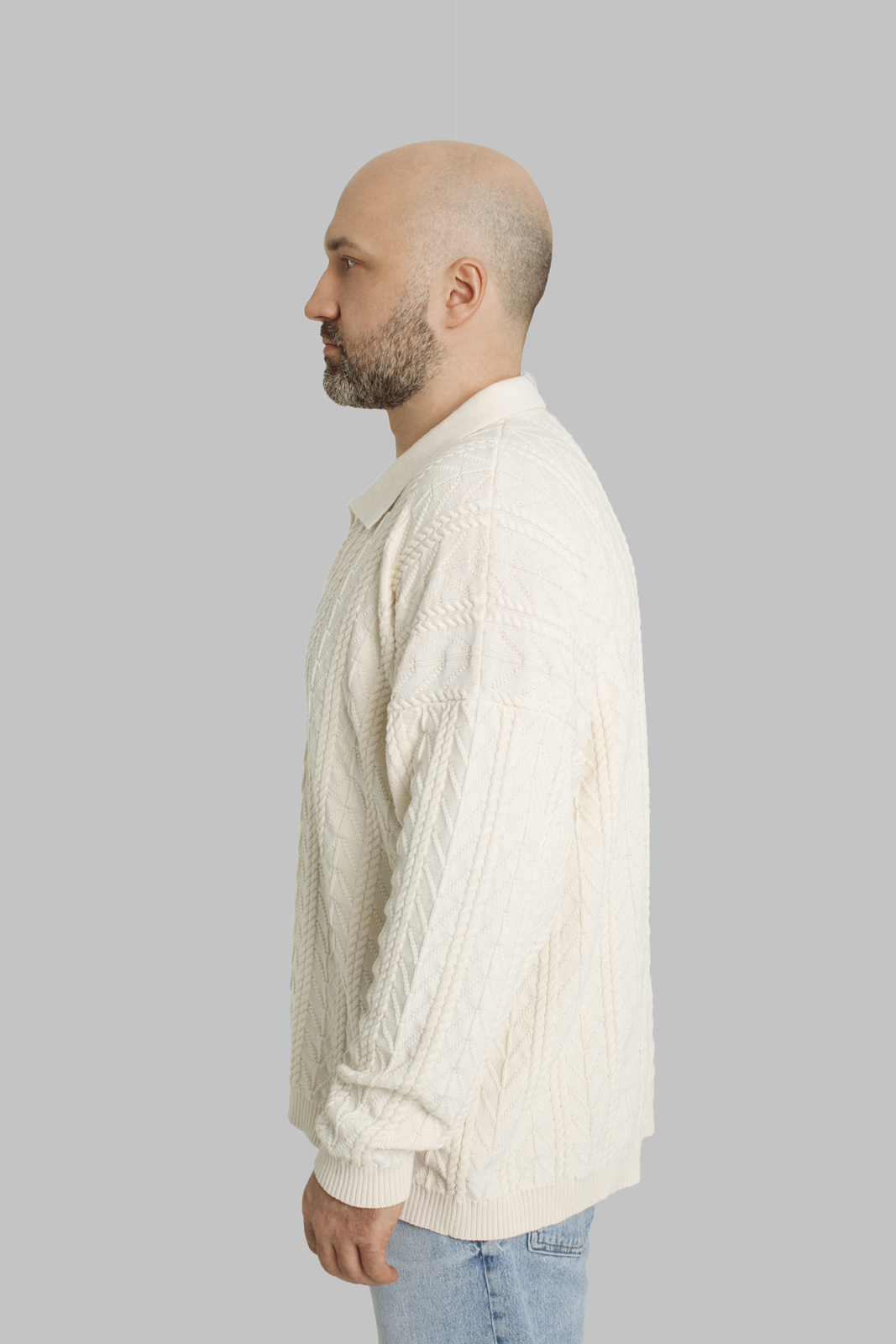 Джемпер с воротником поло бежевого цвета из 100% нитей неокрашенного хлопка. Базовая модель кроя oversize. Изделие с тонким весенним узором, олицетворяющим расцвет весны. На задней части воротника вывязана пчелка VAHROMO. Спущенное плечо, удлинение по длине спинки, не широкий манжет. Джемпер отлично сочетается, как с поддетой вниз футболкой, так и без нее.