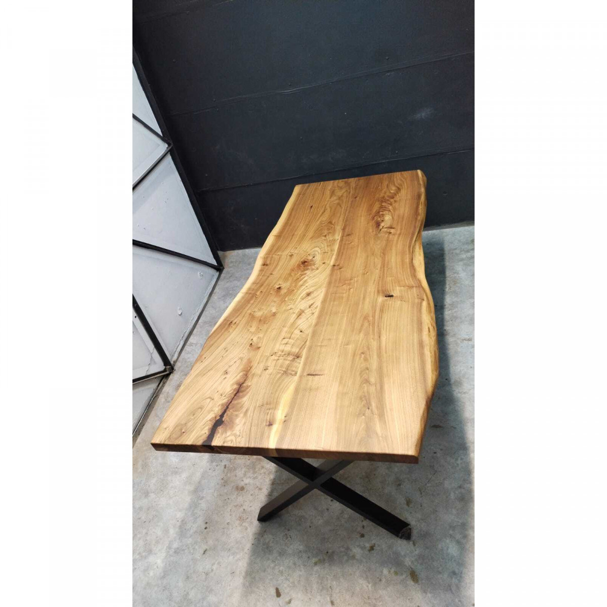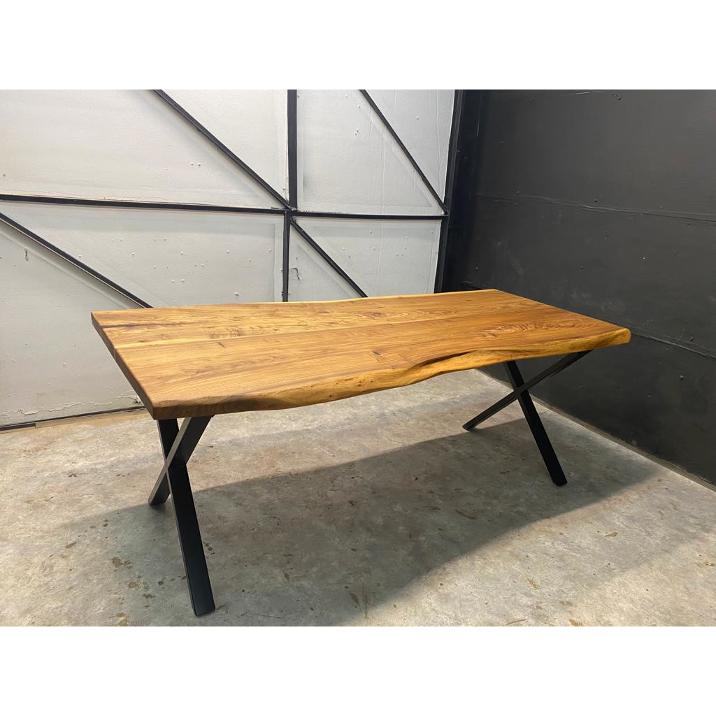 Стол из слэбов карагача. Выполнен в стиле Loft, имеет живые края. Установлен на прочное металлическое подстолье черного цвета.
